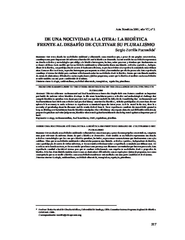 Zorrilla, S. (2001). De una nocividad a la otra: La bioética frente al desafío de cultivar su pluralismo. Acta Bioethica, 7(2), pp. 1-23.