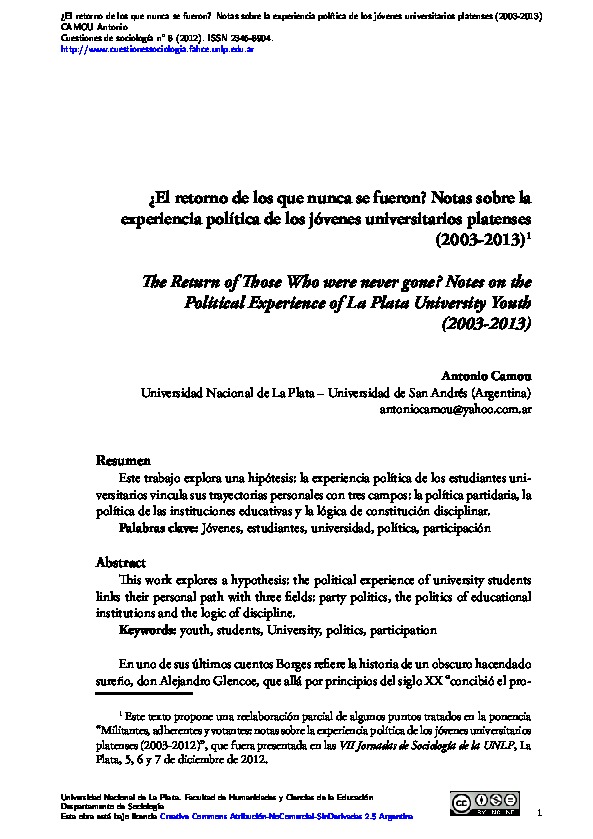 Camou, A. (2012). ¿El retorno de los que nunca se fueron? Notas sobre la experiencia política de los jóvenes universitarios platenses (2003-2013). Cuestiones de Sociología, (8), pp. 1-8.