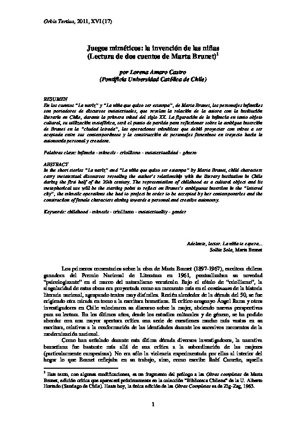 Amaro, L. (2011). Juegos miméticos: la invención de las niñas (Lectura de dos cuentos de Marta Brunet). Orbis Tertius, 16 (17), pp. 1-9.