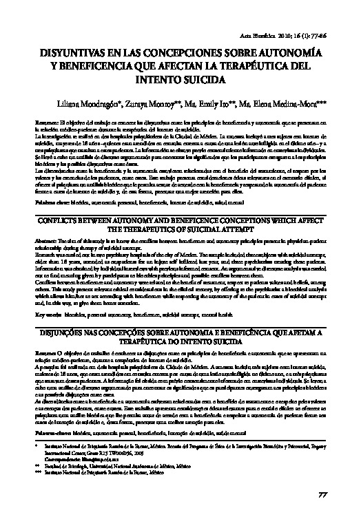 Mondragón, L. Monroy, Z. Ito, Medina, M. (2010). Disyuntivas en las concepciones sobre autonomía y beneficiencia que afectan la terapéutica del intento suicida. Acta Bioethica, 16(1), pp. 1-10.