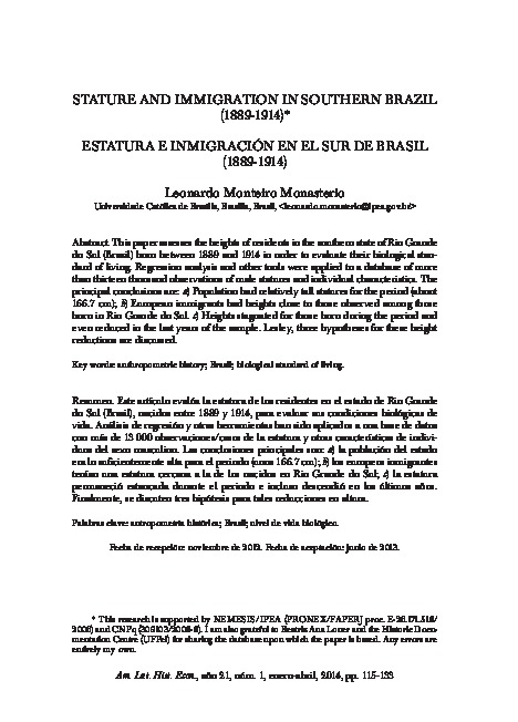 Monteiro, L. (2014). Estatura e inmigración en el sur de Brasil (1889-1914). América Latina en la Historia Económica, 21 (1), pp. 115-133.