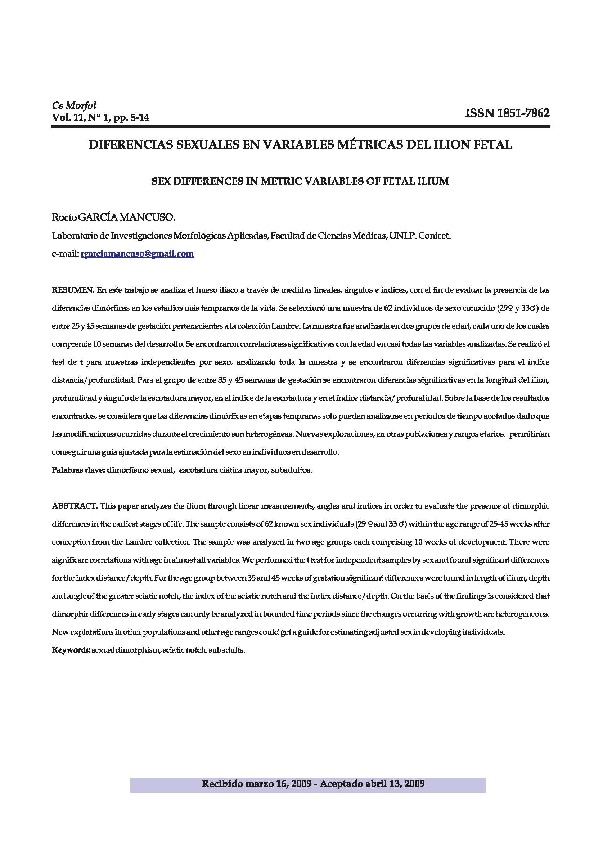 García, R. (2009). Diferencias sexuales en variables métricas del ilion fetal. Ciencias Morfológicas, 11 (1), pp. 5-14