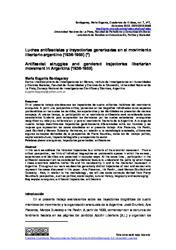 Bordagaray, M. (2013). Luchas antifascistas y trayectorias generizadas en el movimiento libertario argentino (1936-1955). Cuadernos de H Ideas, 7 (7), pp. 1-18