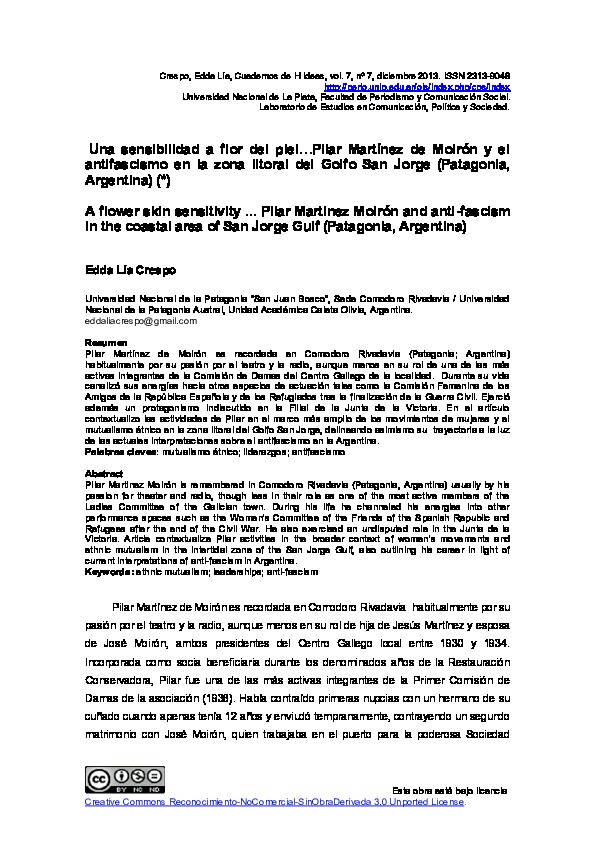 Crespo, E. (2013). \"Una sensibilidad a flor de piel...\": Pilar Martínez de Moirón y el antifascismo en la zona litoral del golfo San Jorge (Patagonia, Argentina). Cuadernos de H Ideas, 7 (7), pp. 1-25