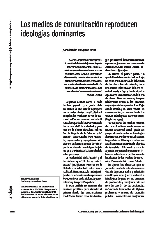 Vasquez, C. (2009). Los medios de comunicación reproducen ideologías dominantes. Tram[p]as de la Comunicación y la Cultura, (66), pp. 100-102