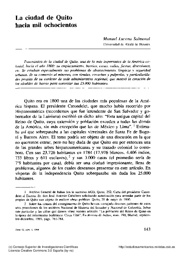 Lucena, M. (1994). La ciudad de Quito hacia mil ochocientos. Anuario de Estudios Americanos, 51 (1), pp. 143-164.