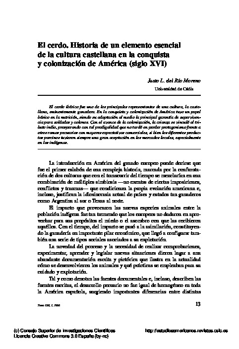 Del Río, J, (1996). El cerdo. Historia de un elemento esencial de la cultura castellana en la conquista y colonización de América (siglo XVI). Anuario de Estudios Americanos, 53 (1), pp. 13-35.