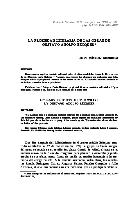 Ménguez, F. (2010). La propiedad literaria de las obras de Gustavo Adolfo Bécquer. Revista de Literatura, 72 (143), pp. 119-136.